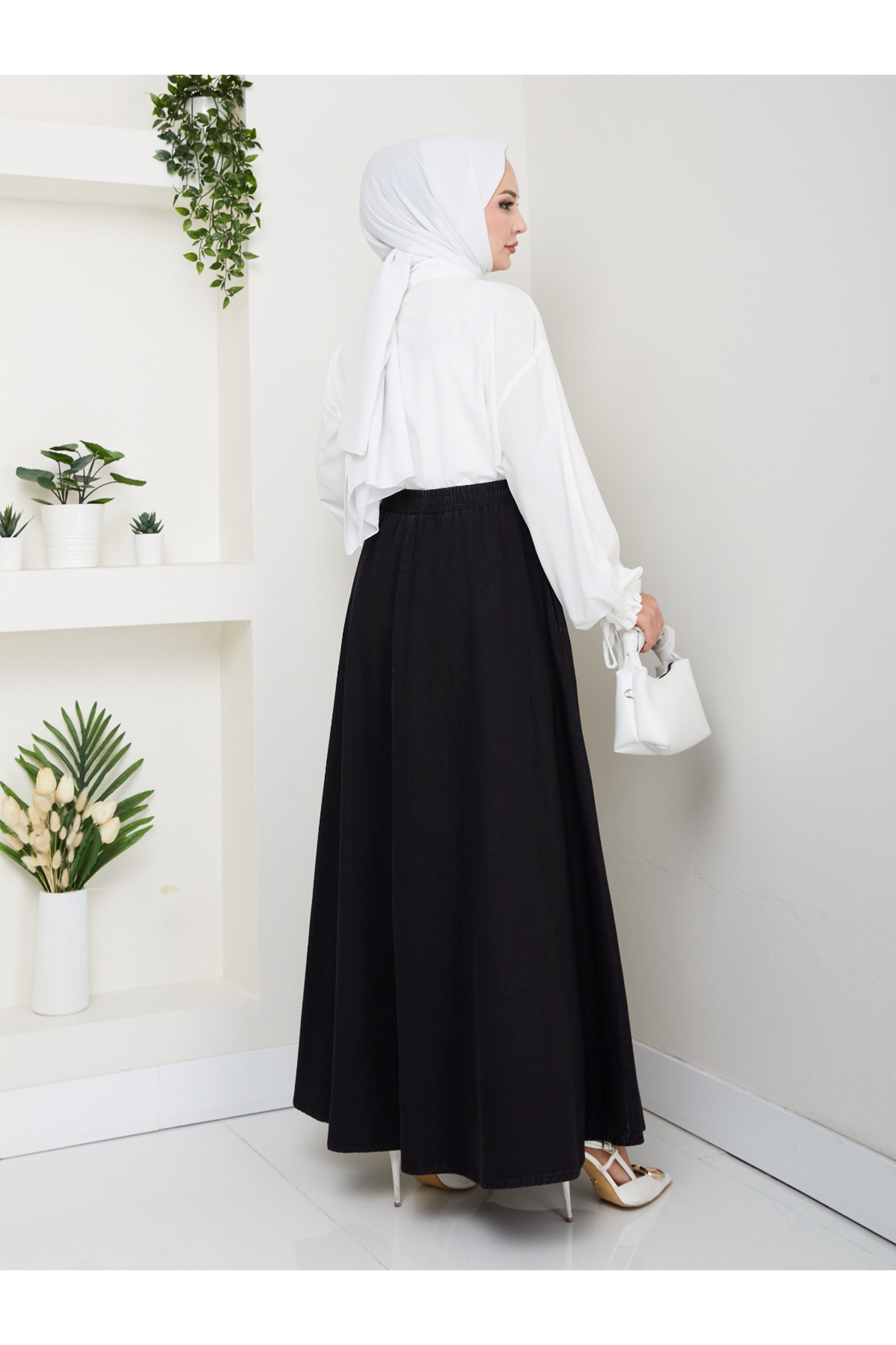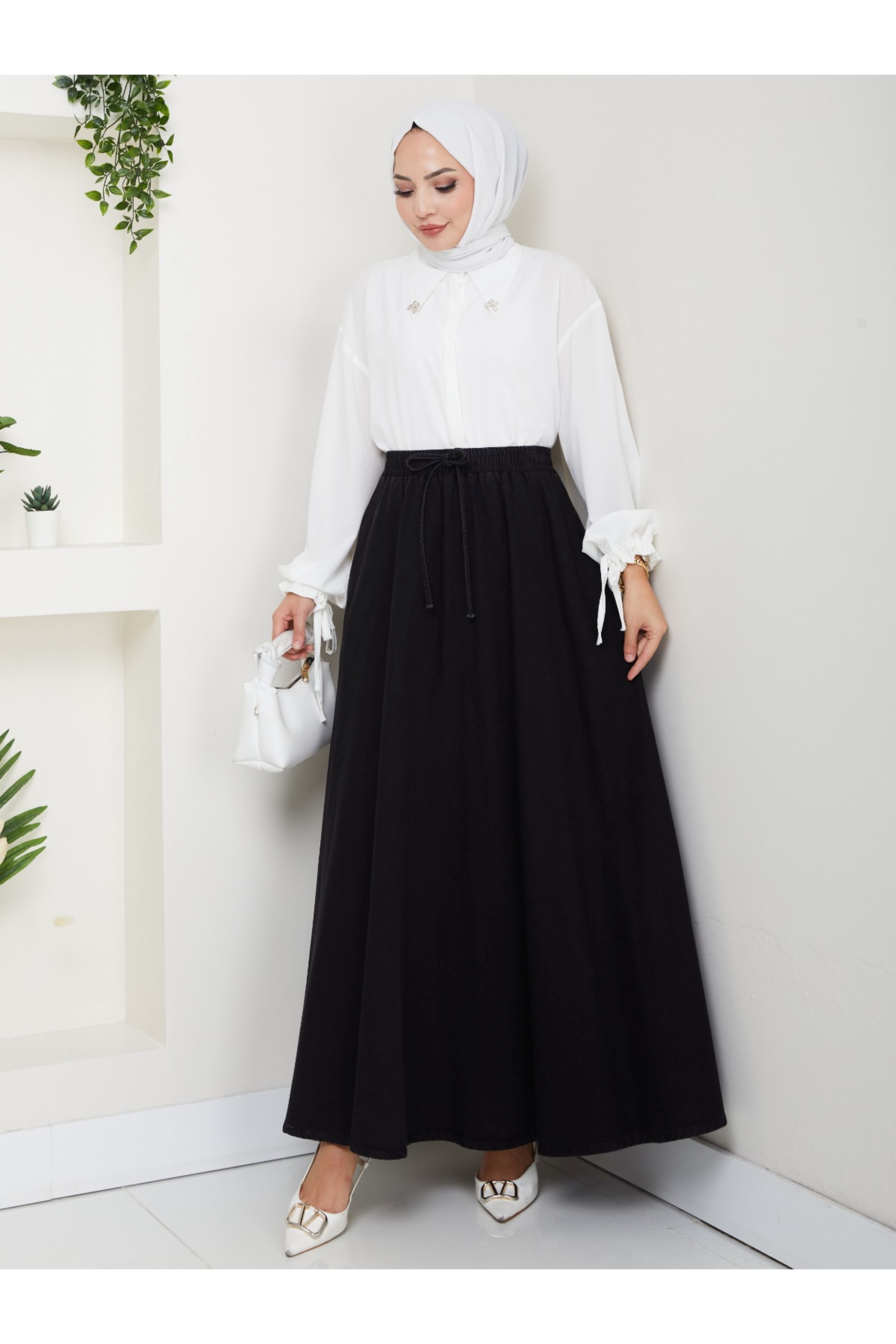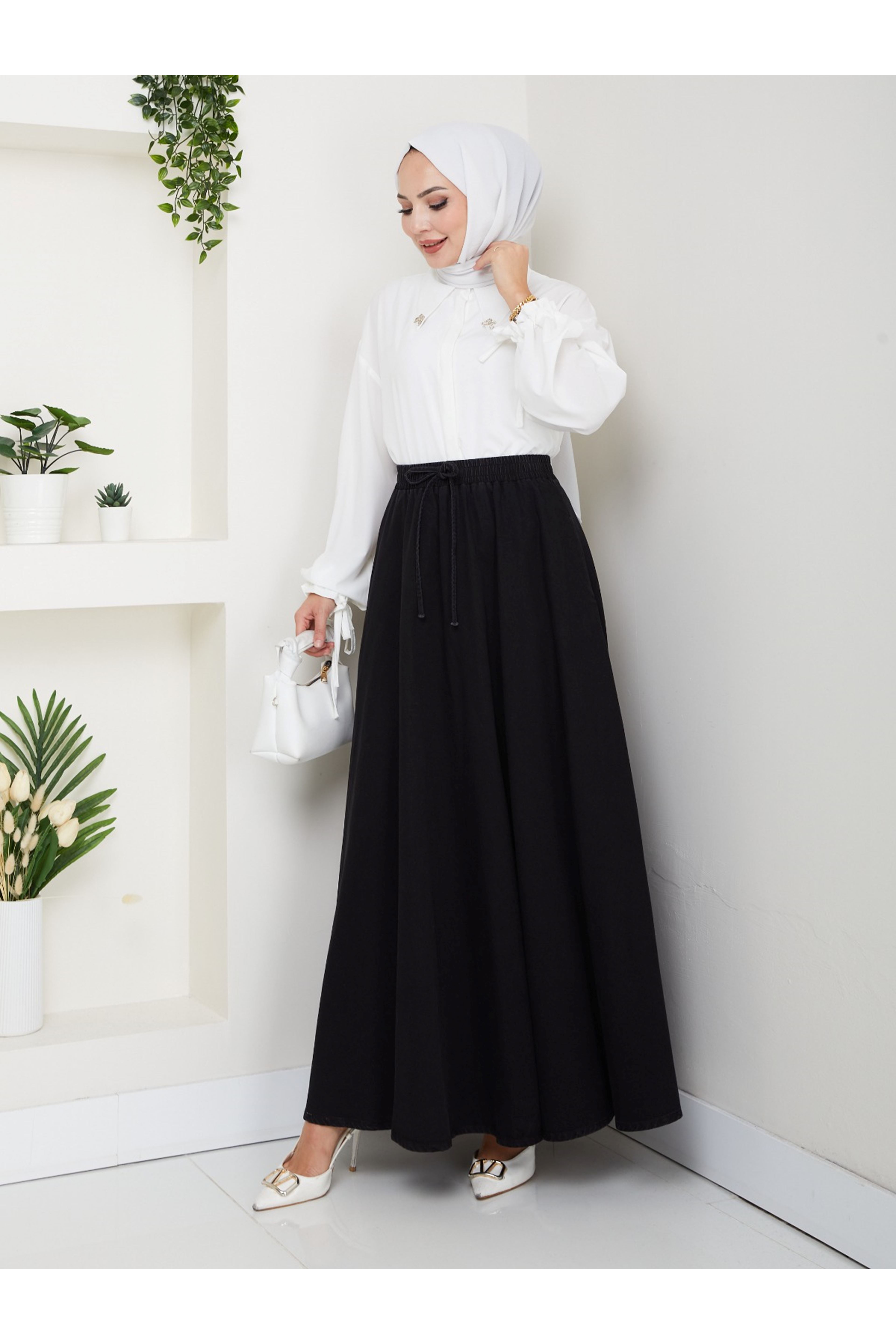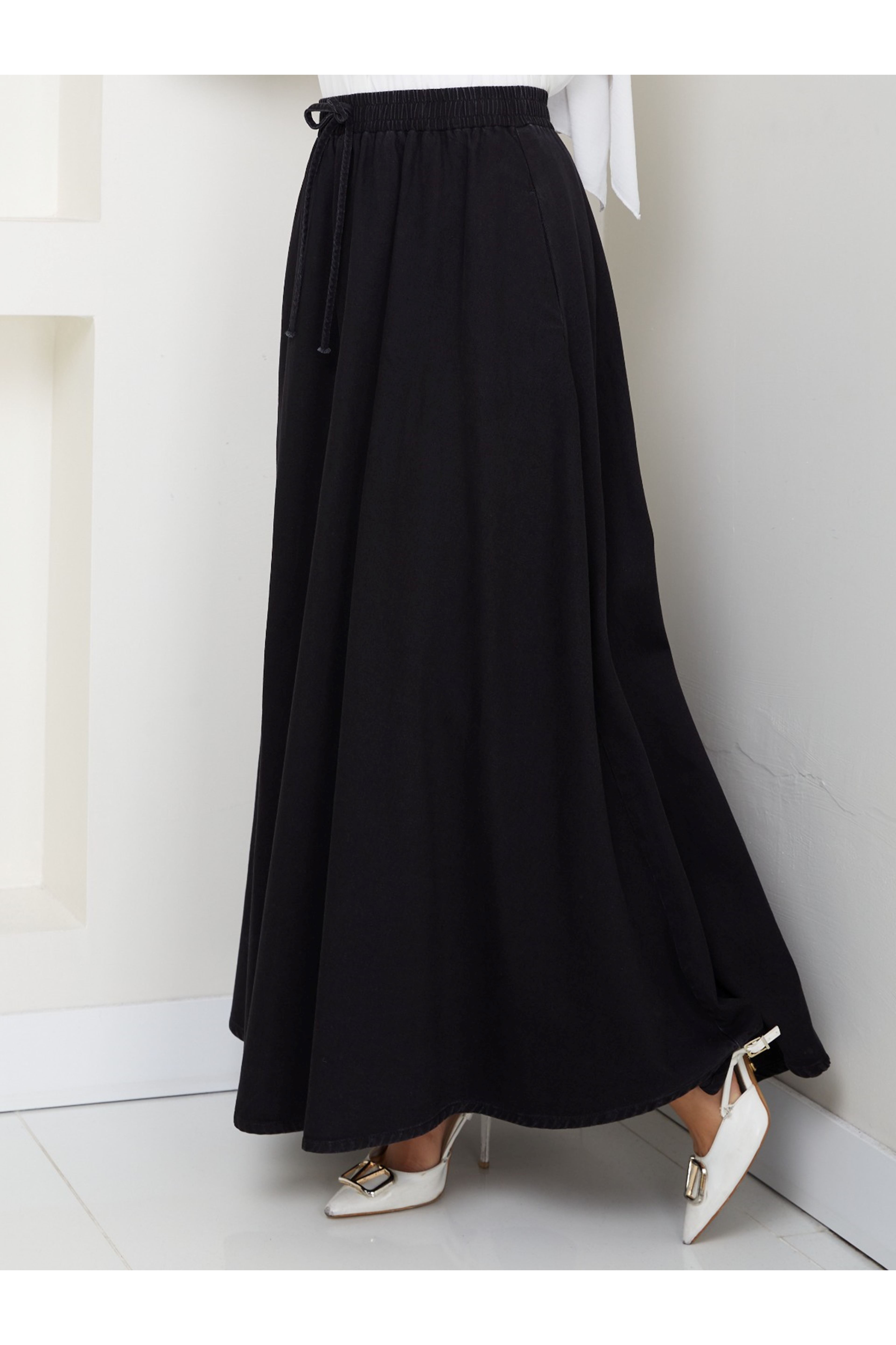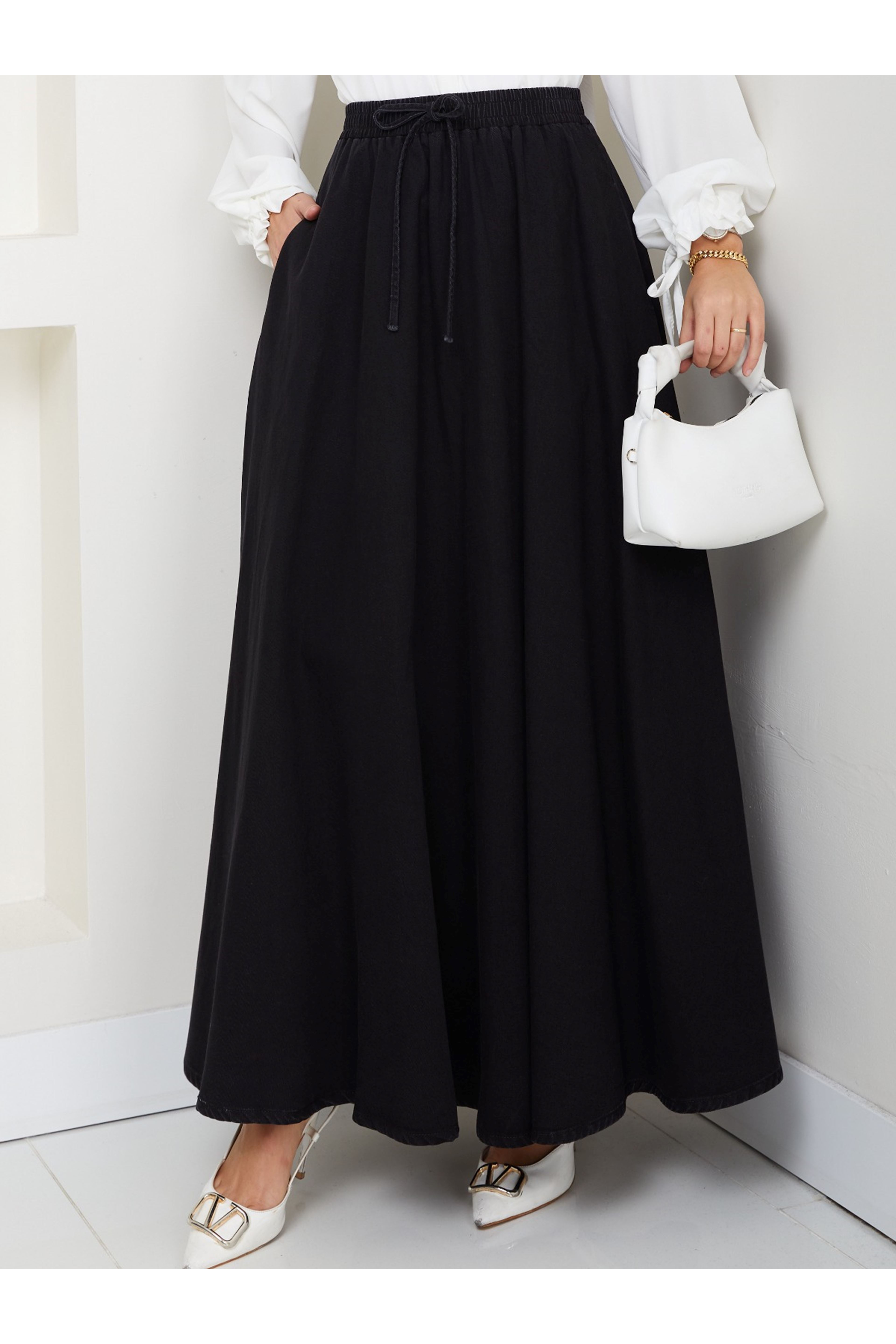 BELİ LASTİKLİ İPLİ KOT KLOŞ ETEK SİYAH