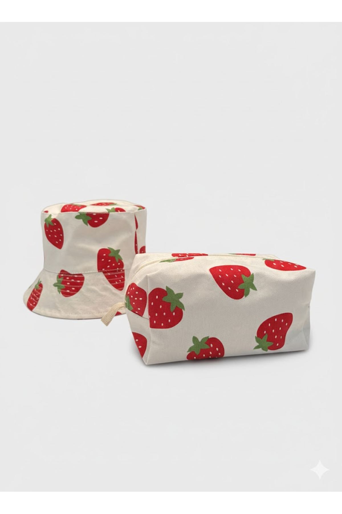 Tatlı çilek desenleriyle tasarlanan şapka ve makyaj çantası seti, yazın enerjisini stiline taşır! Hem kullanışlı hem şık bir kombin.