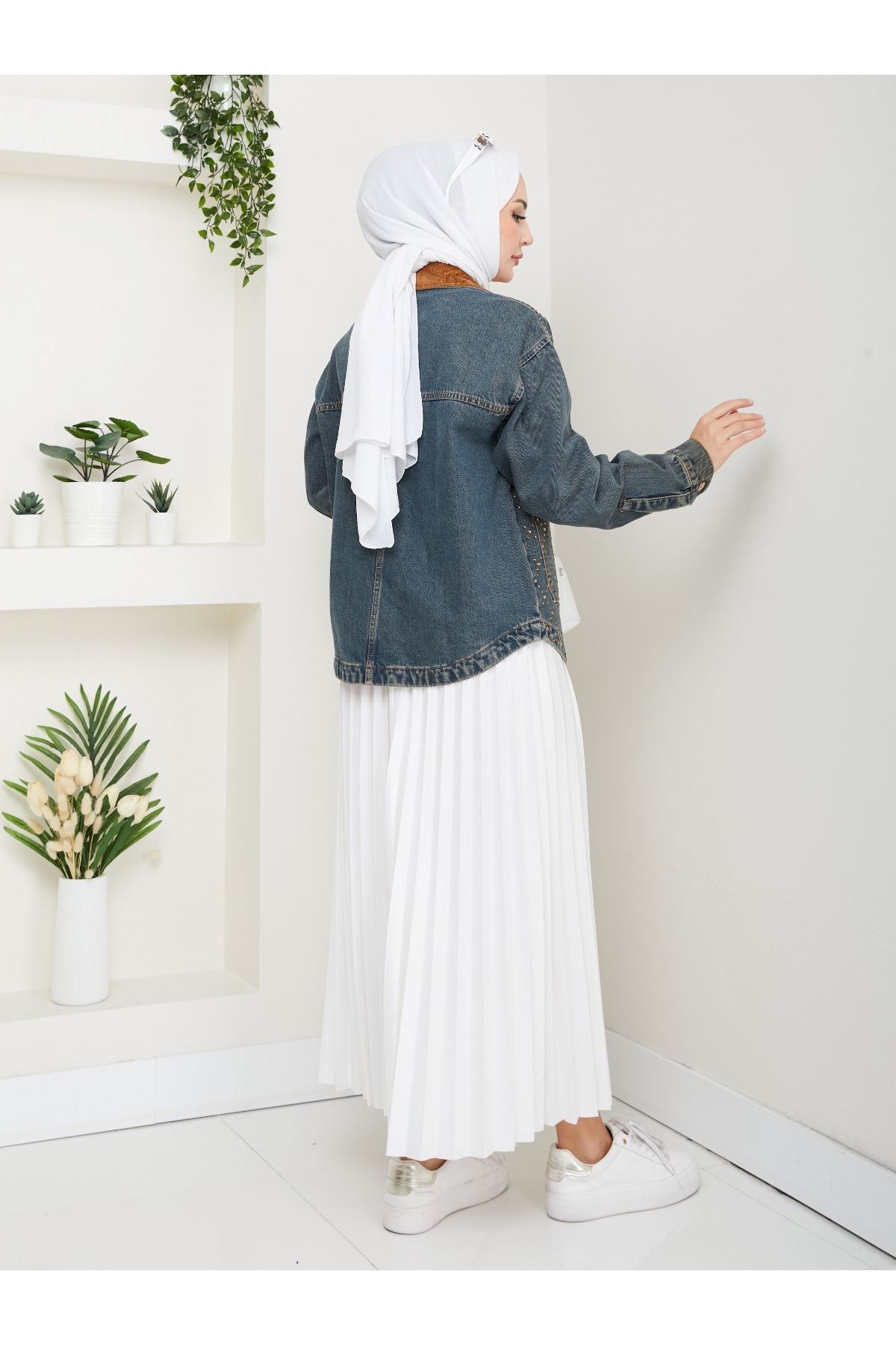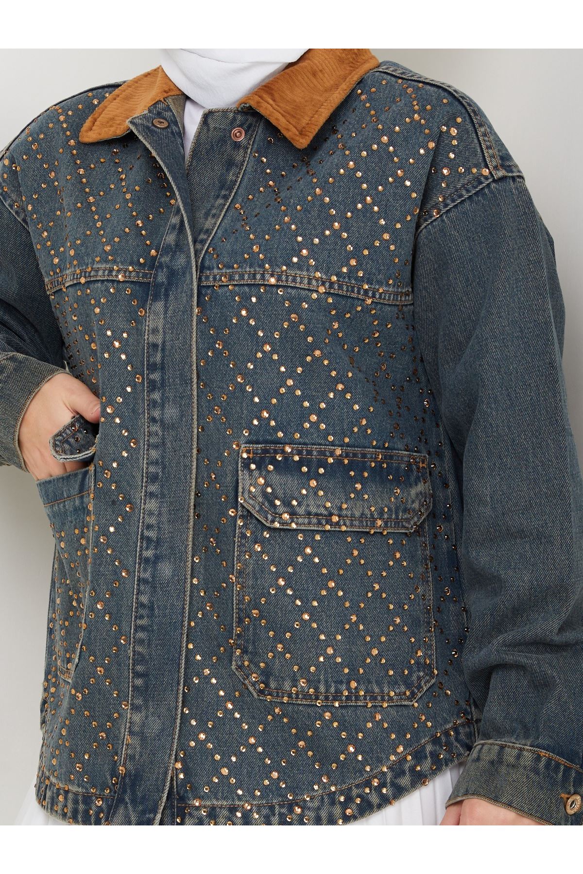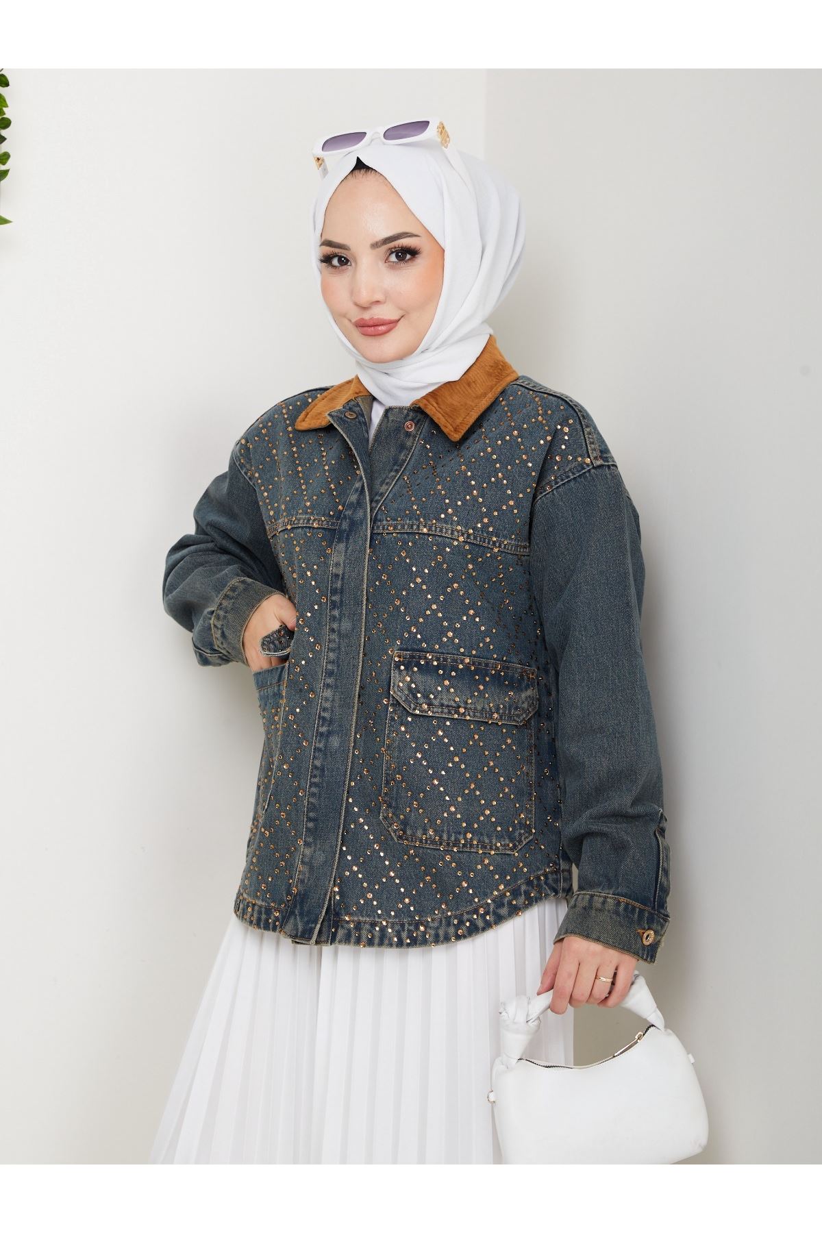KADİFE YAKALI KOT CEKET KOYU MAVİ- BAKLAVA DESNELİ