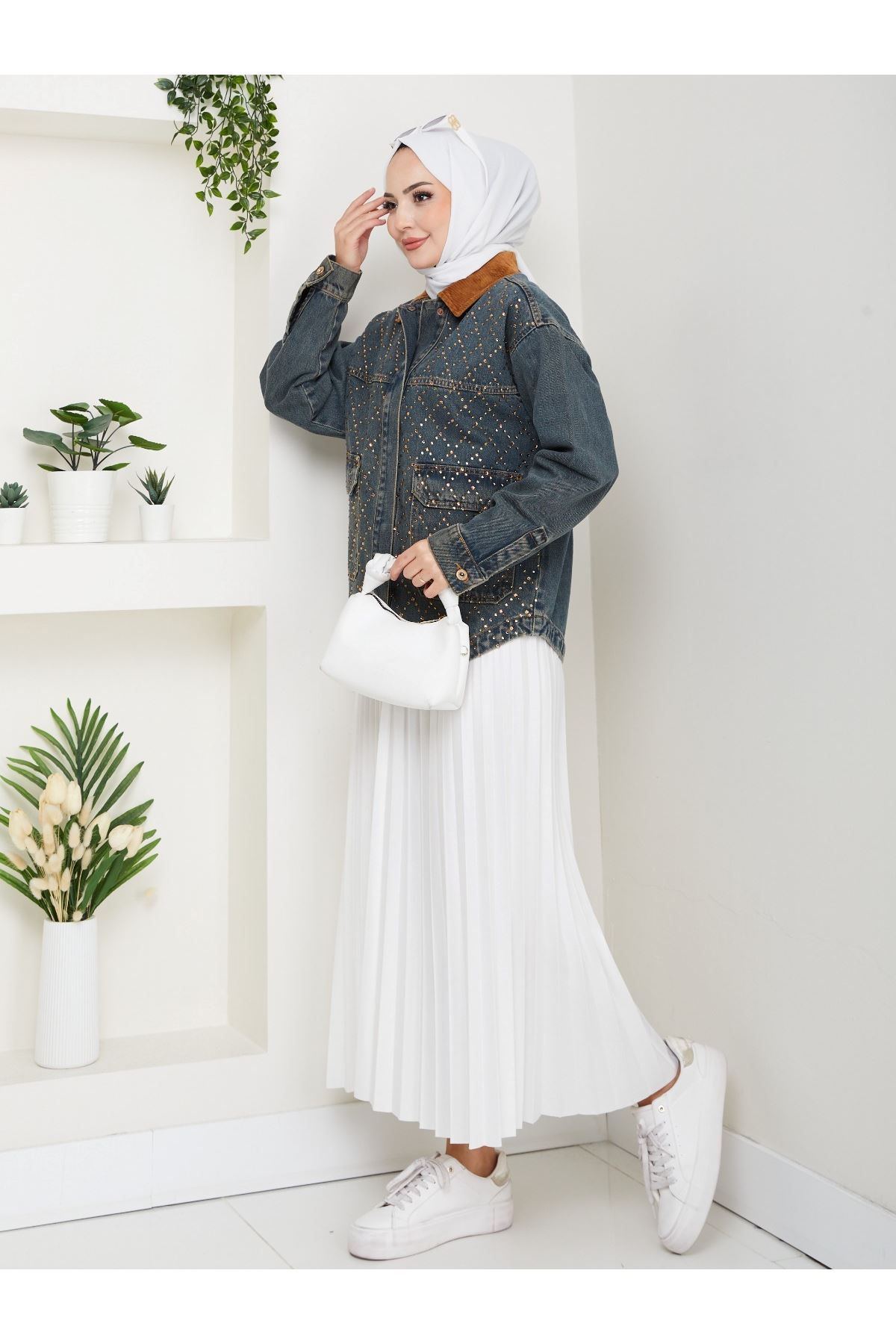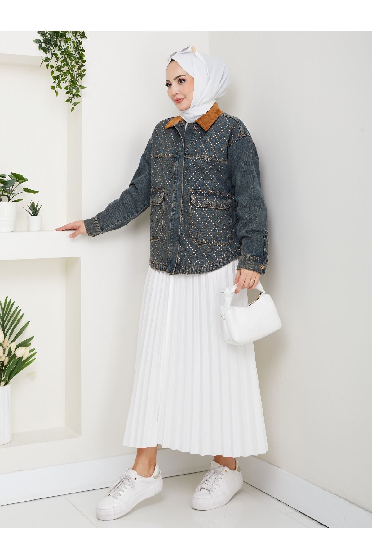 Yumuşak dokulu kadife yaka, cekete zarif bir kontrast sunarken %100 pamuk denim kumaşı gün boyu konfor sağlar.