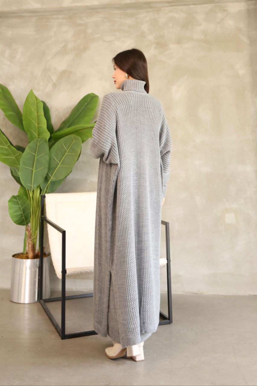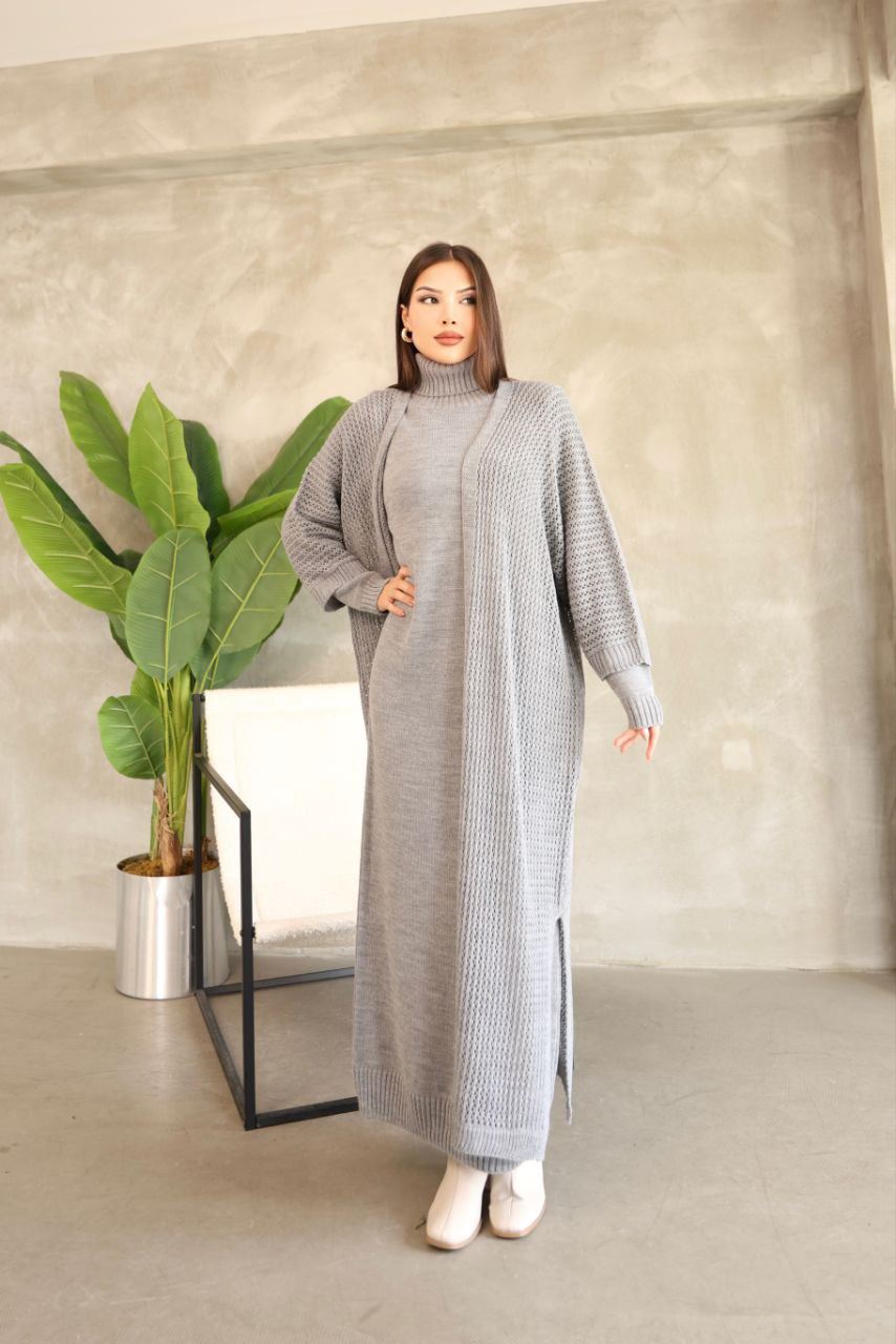 KADIN BOĞAZLI TRİKO ELBİSE VE UZUN HIRKA İKİLİ TAKIM-GRİİ