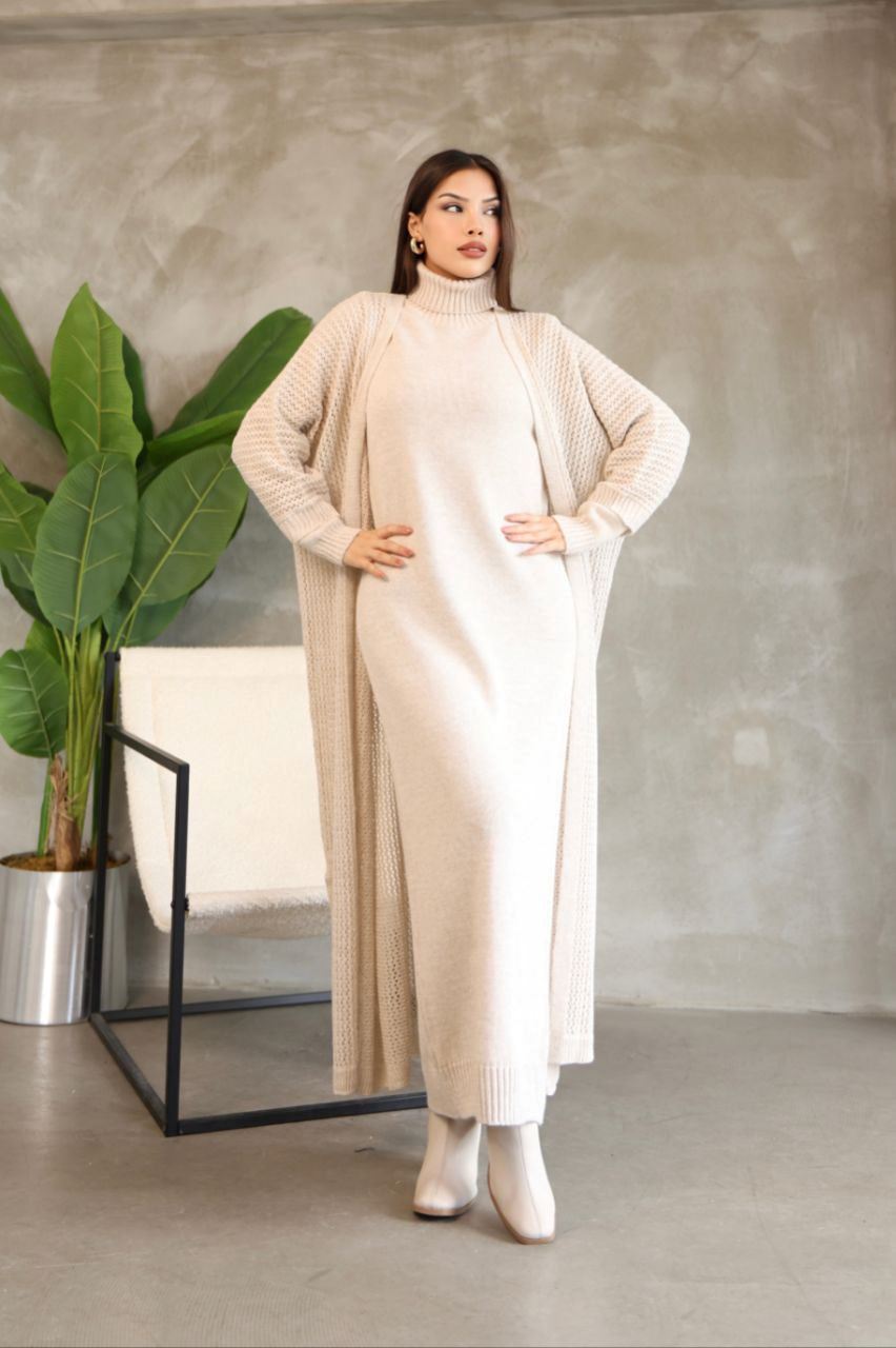 KADIN BOĞAZLI TRİKO ELBİSE VE UZUN HIRKA İKİLİ TAKIM-KREM