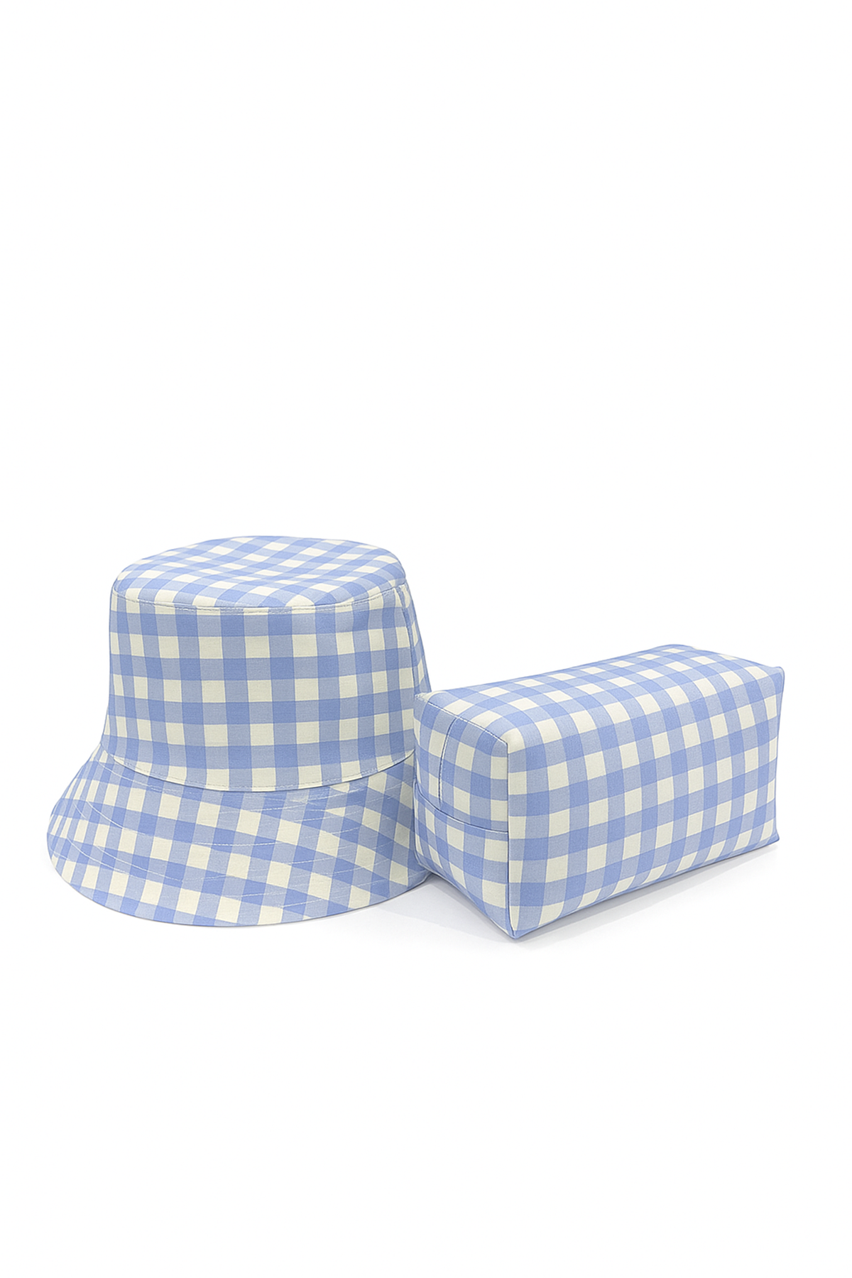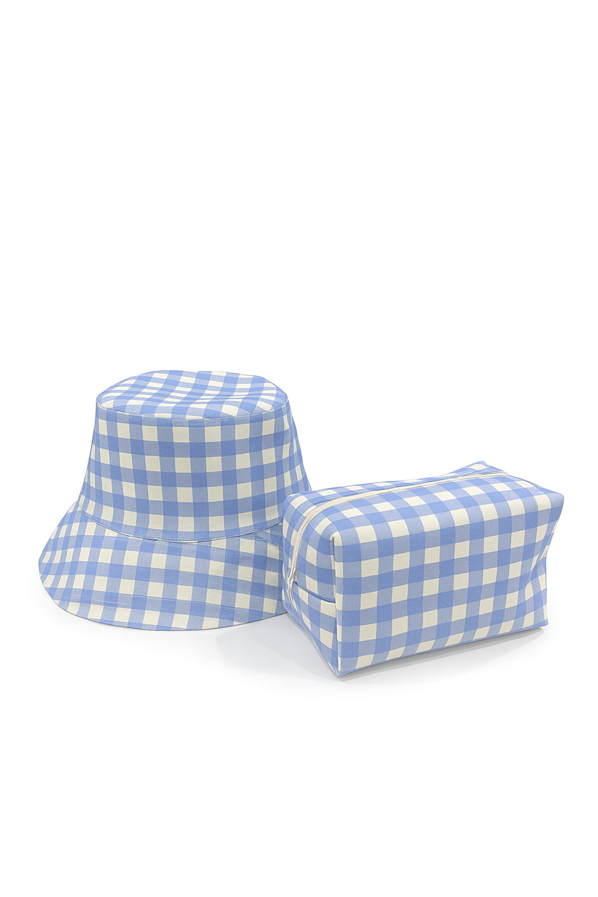 Modern ve sade tarzın en tatlı hali! Mavi ekose desenli şapka ve makyaj çantası setiyle yazın ferahlığını tarzına taşı.