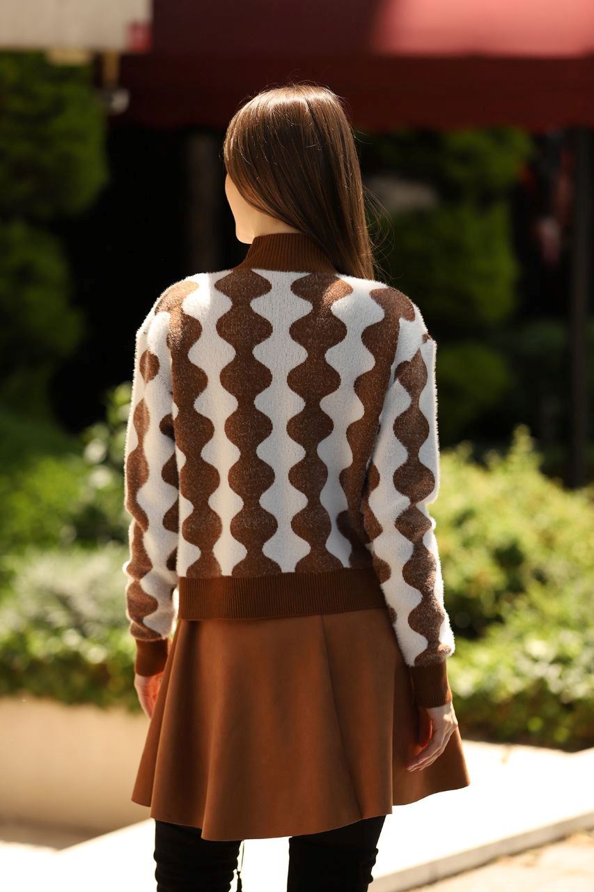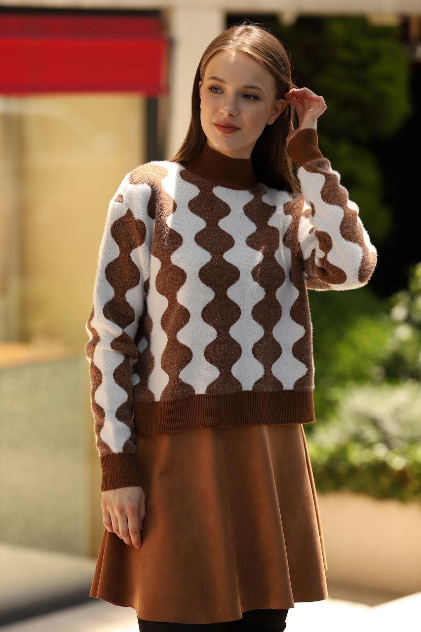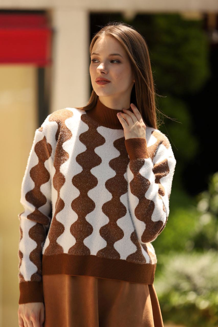 Şıklığın ve Konforun Buluştuğu Modern Stil: Kahverengi Beyaz Dalga Desenli Triko Kazak