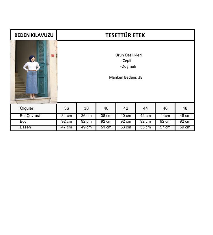 Kumaş Bilgisi: %98 Cotton, %2 Elastan. Doğal, yumuşak kumaşlı kot etek. Kemer ürüne dahildir. Resimdeki ürünün ölçüleri: Beden: 38 Bel: 69 cm Basen: 94 cm Boy: 94 cm Bedenler arası 2 cm fark bulunmaktadır.