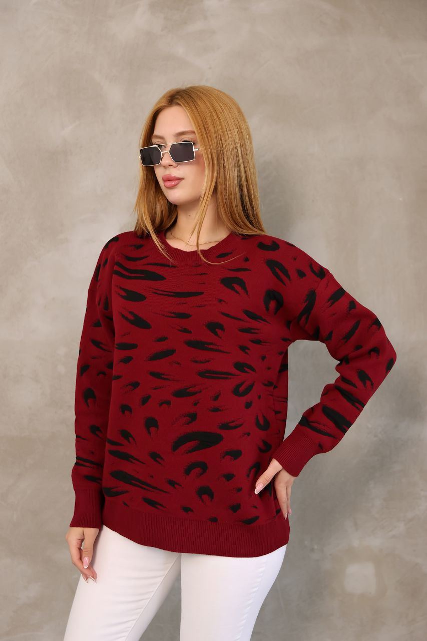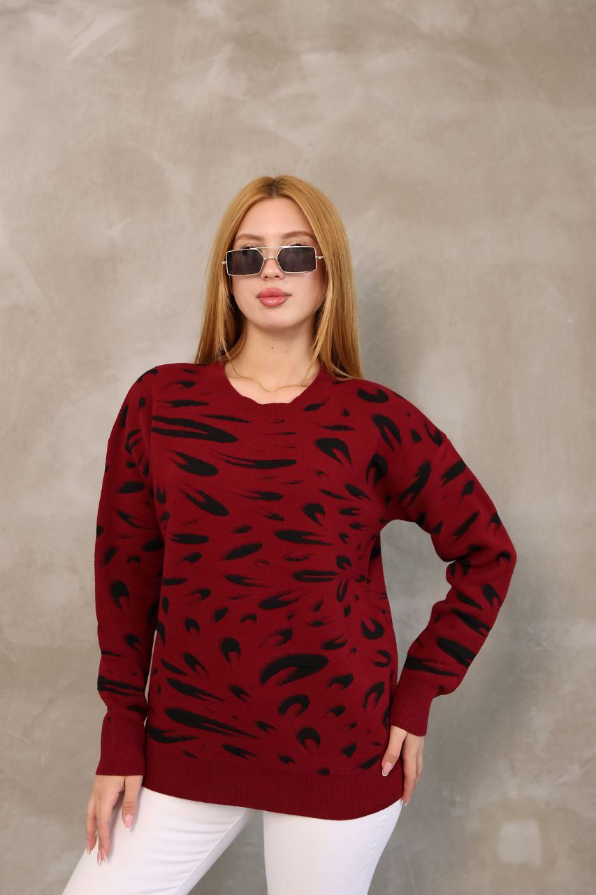 Gardırobunuzda fark yaratacak bir parça arıyorsanız, doğru yerdesiniz! Göz alıcı bordo rengi ve modern siyah desenleriyle bu oversize triko kazak, stiline cesur bir dokunuş katmak isteyen kadınlar için özel olarak tasarlandı. Hem rahat hem de stil sahibi olmak artık çok kolay!