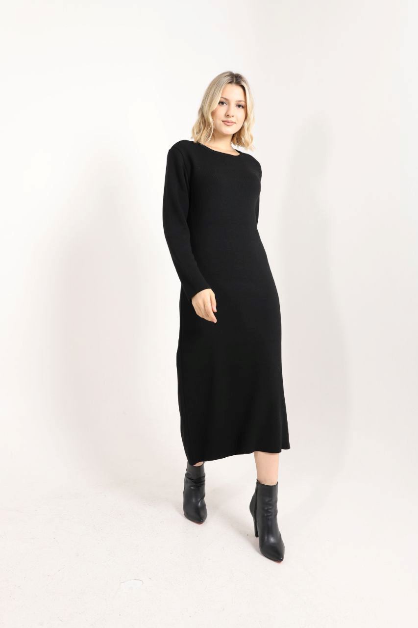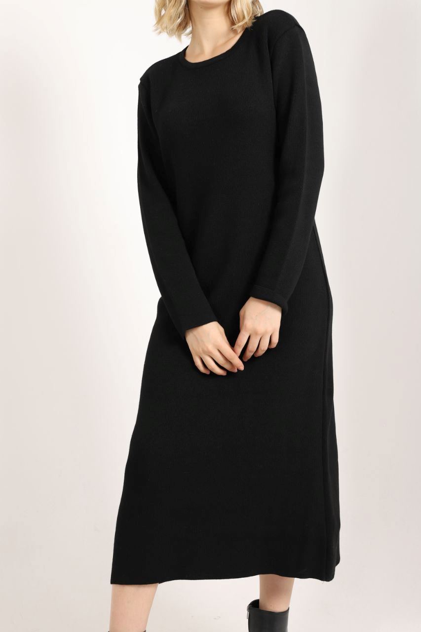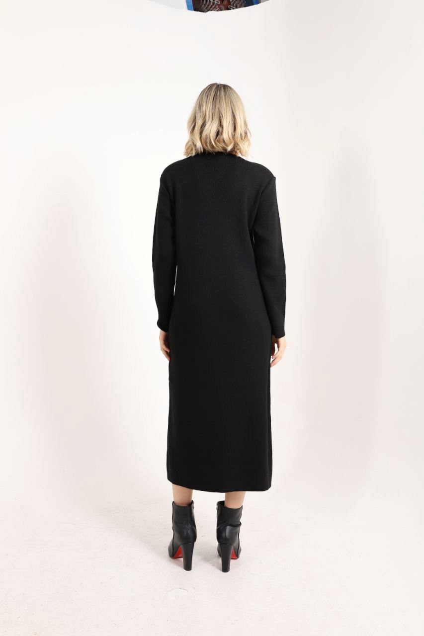 Minimalizmin zarafetle buluştuğu bu siyah uzun triko elbise, sade şıklığıyla her sezon gardırobunun vazgeçilmezi olacak. Vücuda oturan yumuşacık dokusu ve esnek triko yapısıyla hem konforu hem de estetiği bir araya getirir. Diz altına kadar uzanan uzun formu, hem günlük kombinlerde hem de özel davetlerde feminen bir siluet sunar.