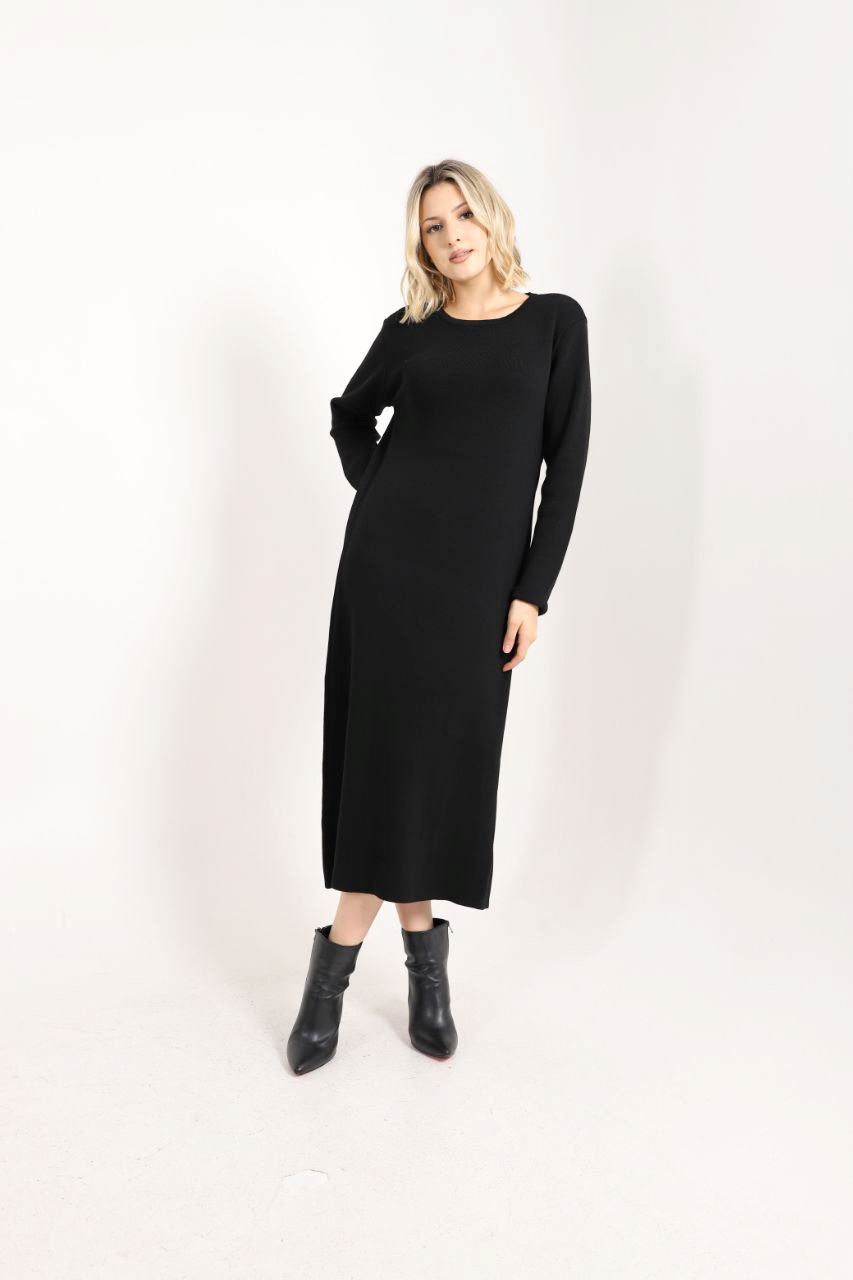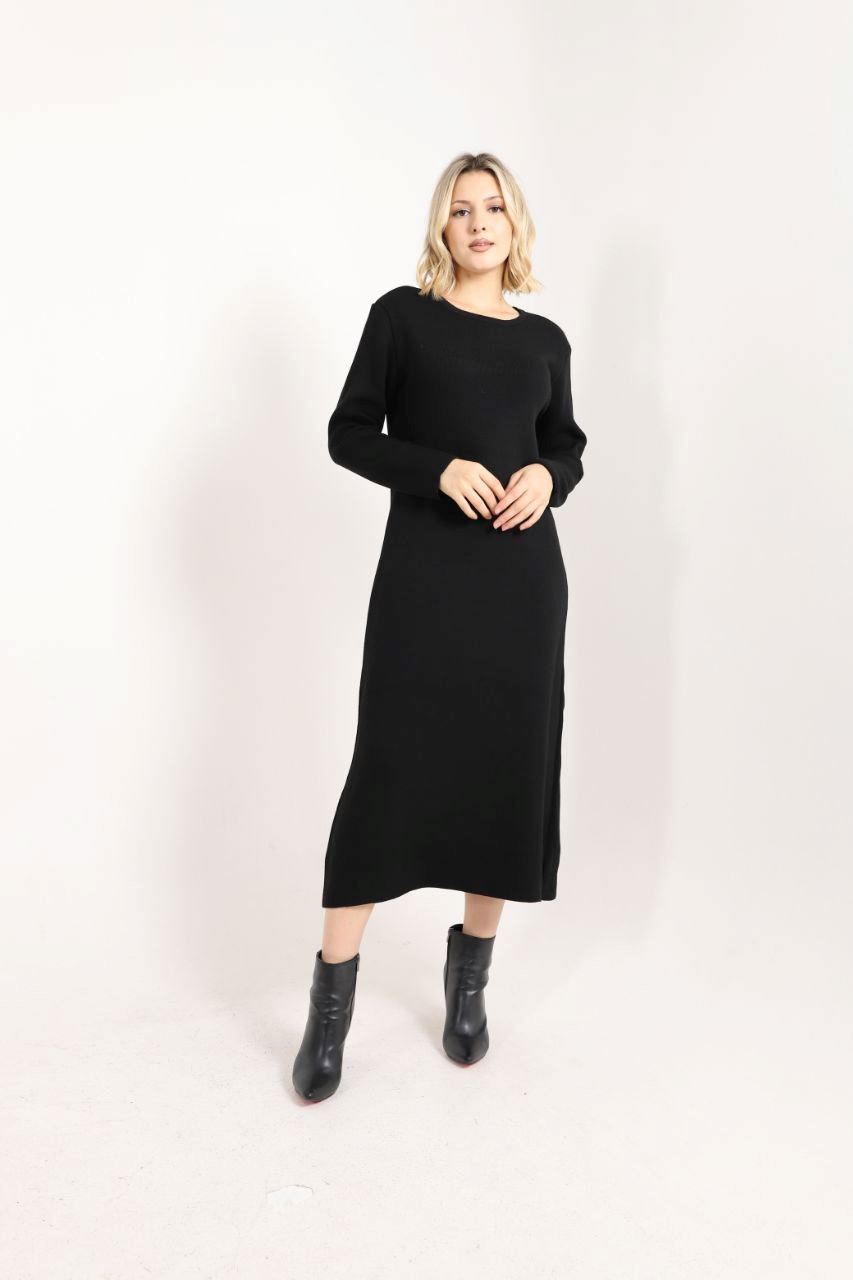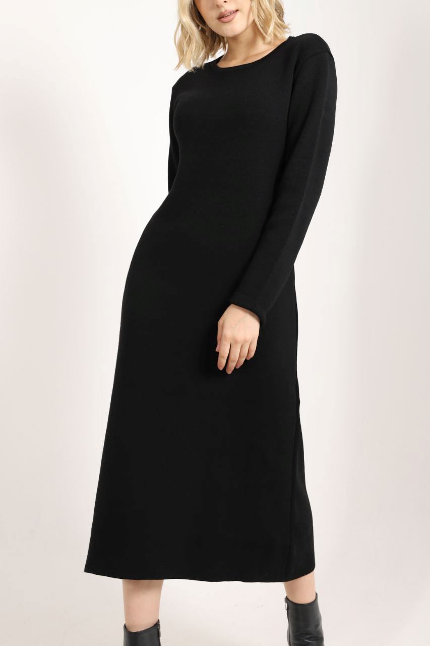 Minimalizmin zarafetle buluştuğu bu siyah uzun triko elbise, sade şıklığıyla her sezon gardırobunun vazgeçilmezi olacak. Vücuda oturan yumuşacık dokusu ve esnek triko yapısıyla hem konforu hem de estetiği bir araya getirir. Diz altına kadar uzanan uzun formu, hem günlük kombinlerde hem de özel davetlerde feminen bir siluet sunar.