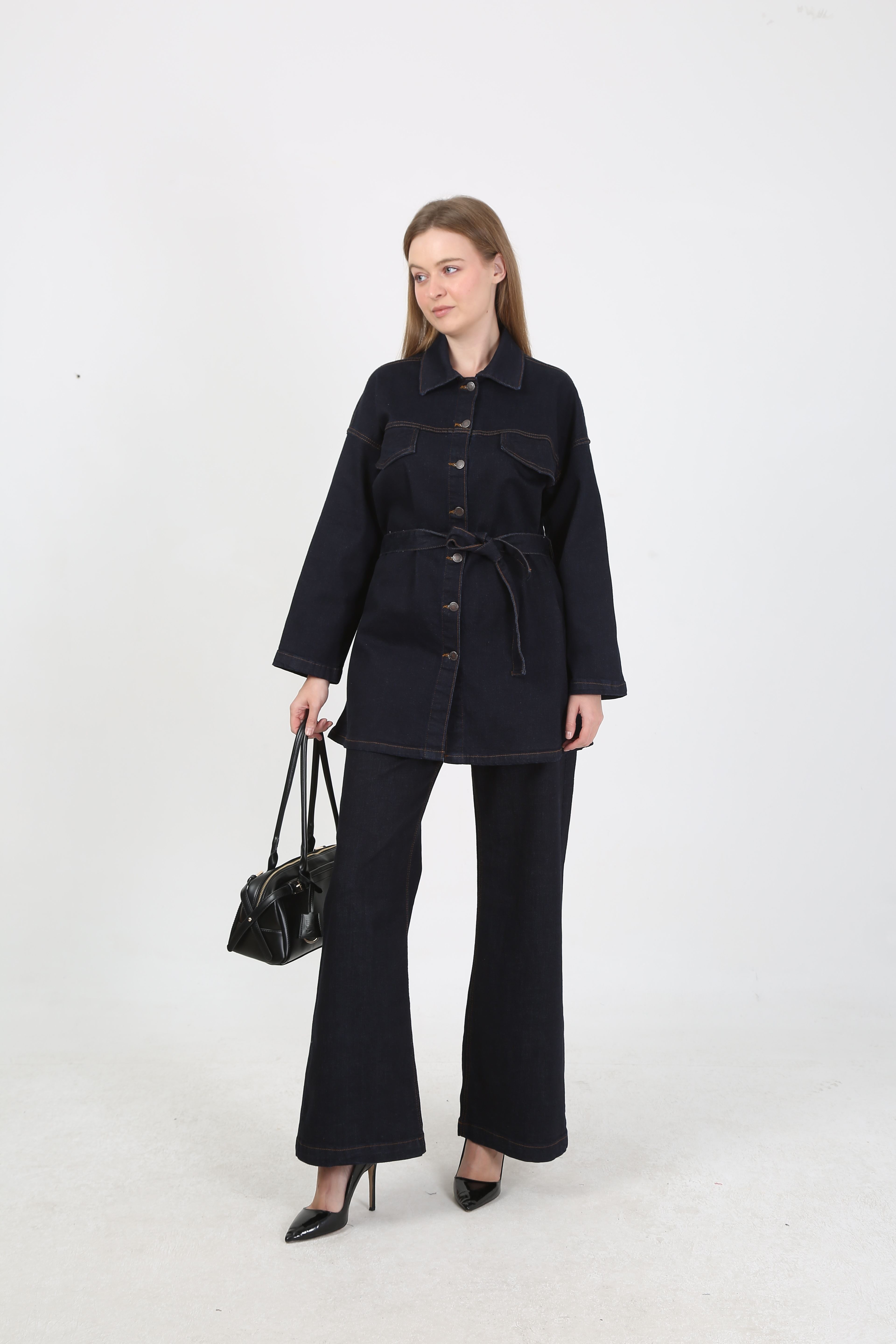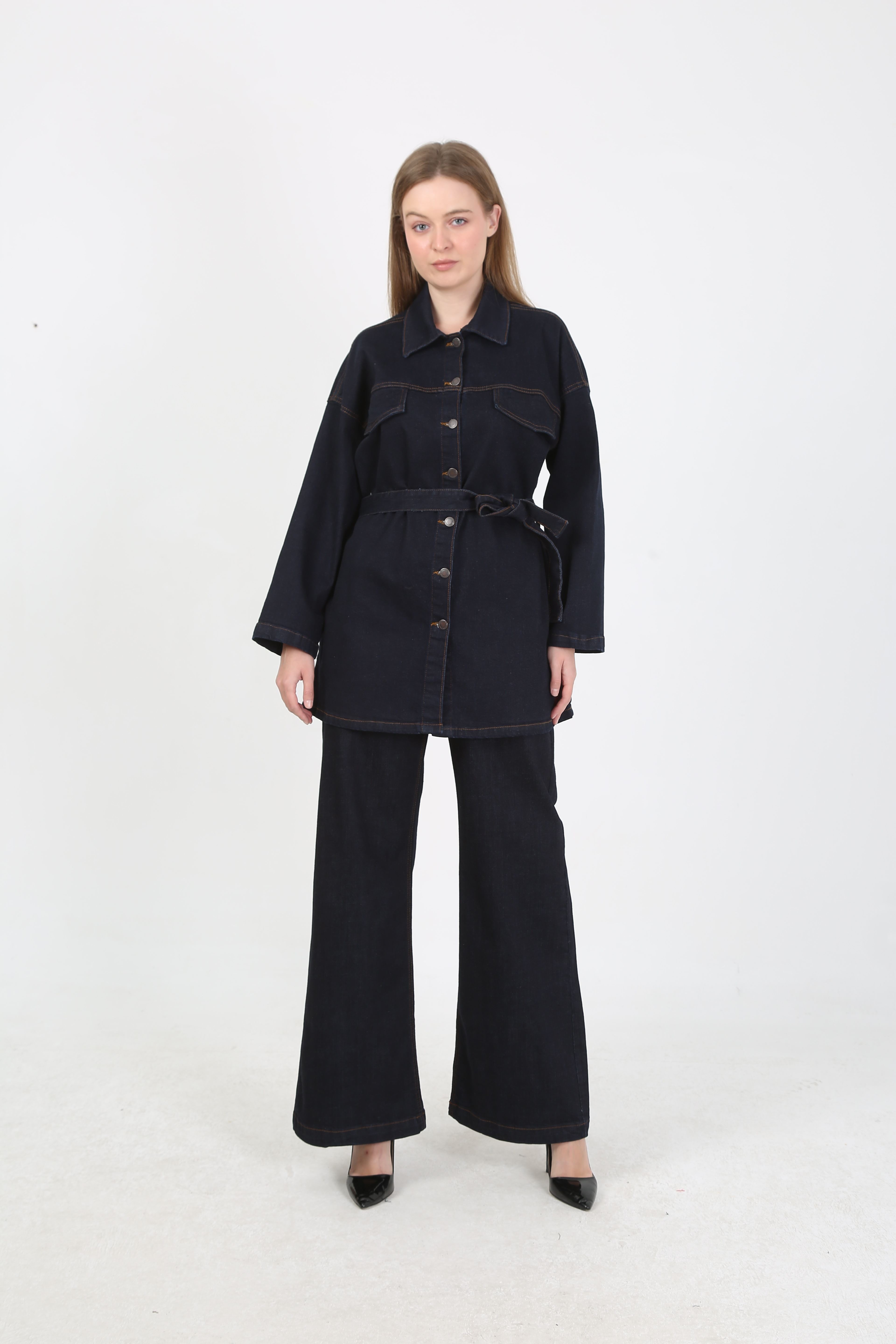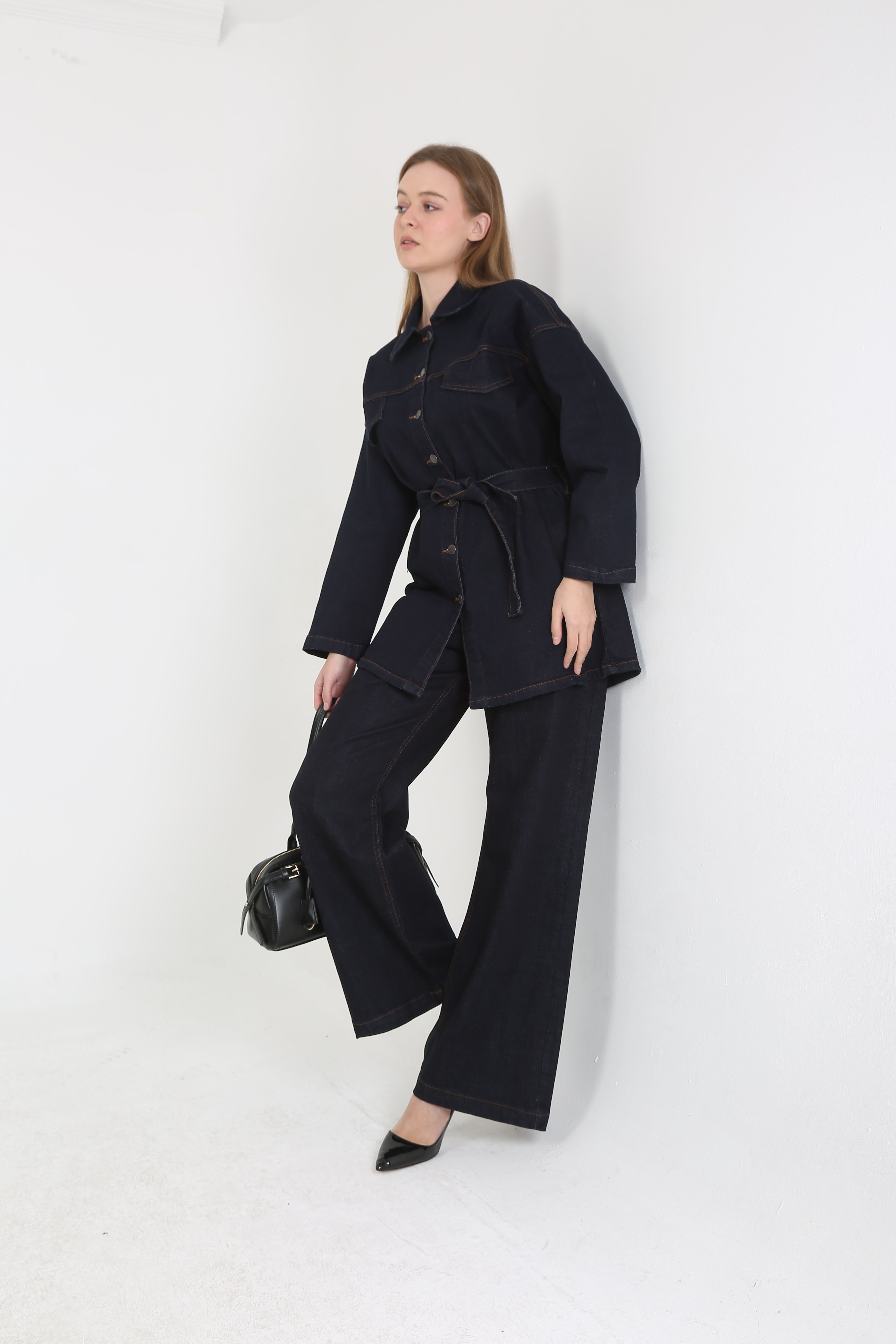 Günlük şıklığı yakalamak isteyenler için tasarlanan kadın denim kot takım, modern görünümüyle dikkat çekiyor. Üst bölümde yer alan kuşaklı uzun jean ceket, vücudu daha formda gösterirken; geniş paça yüksek bel pantolon rahat ve zarif bir duruş sunuyor.