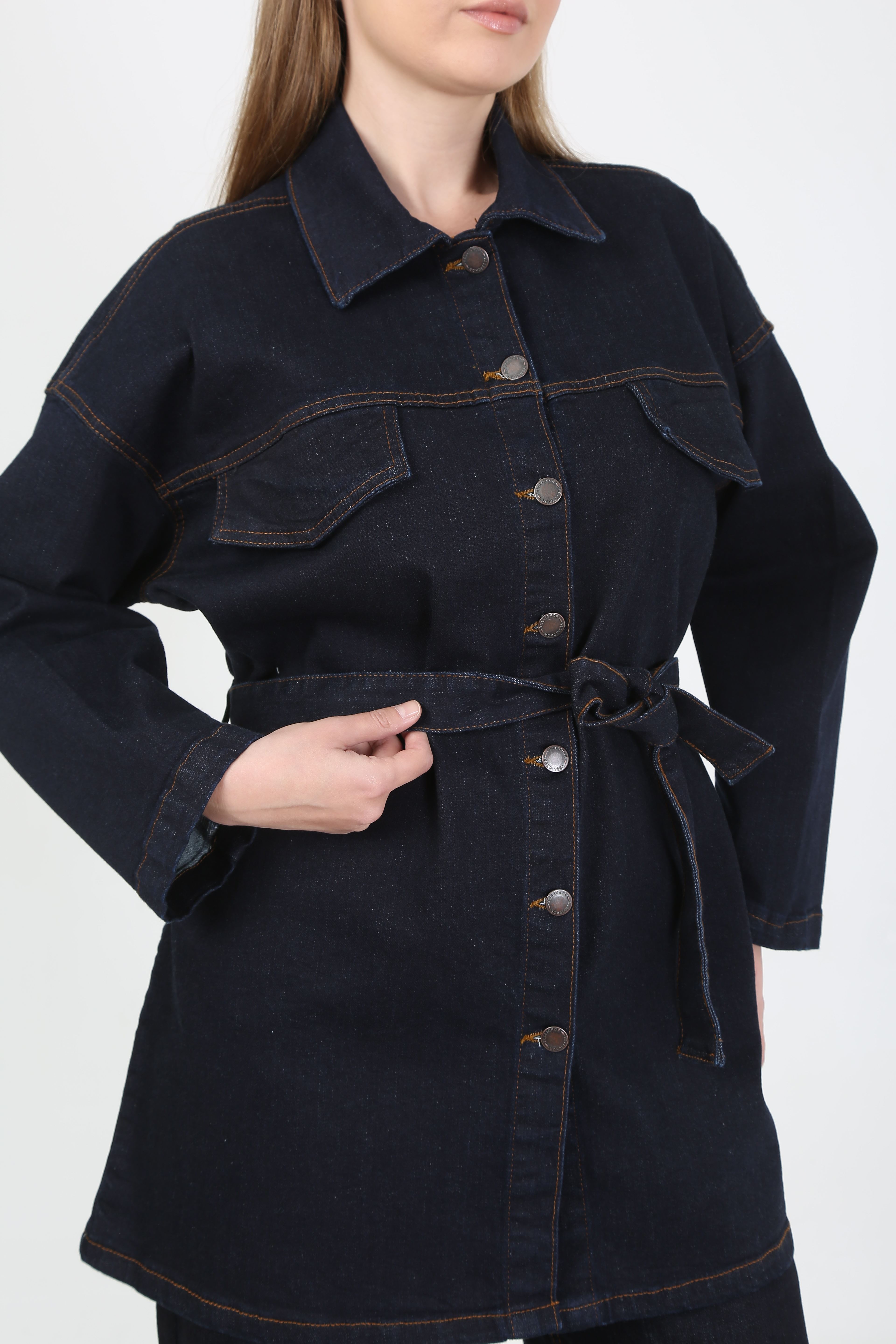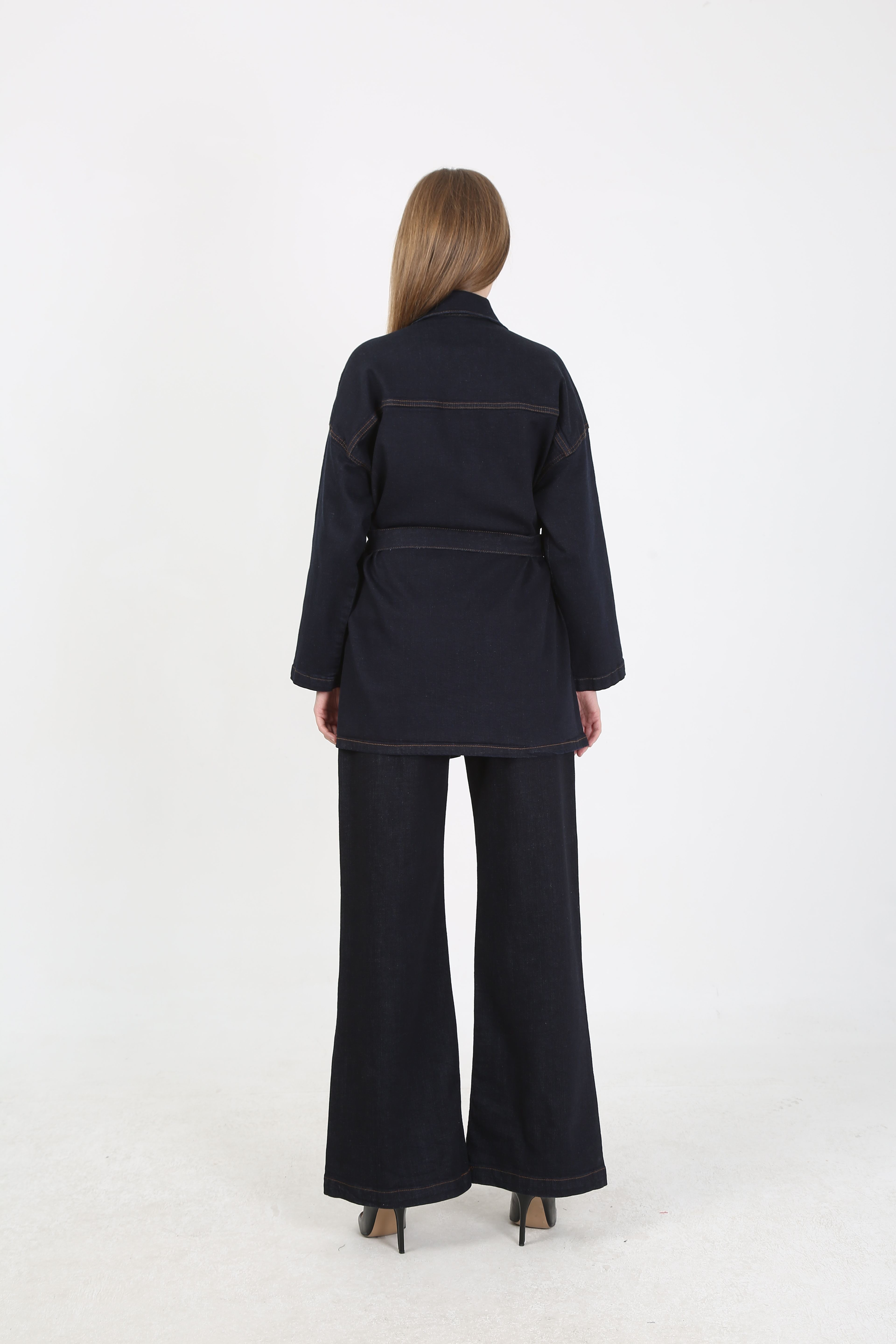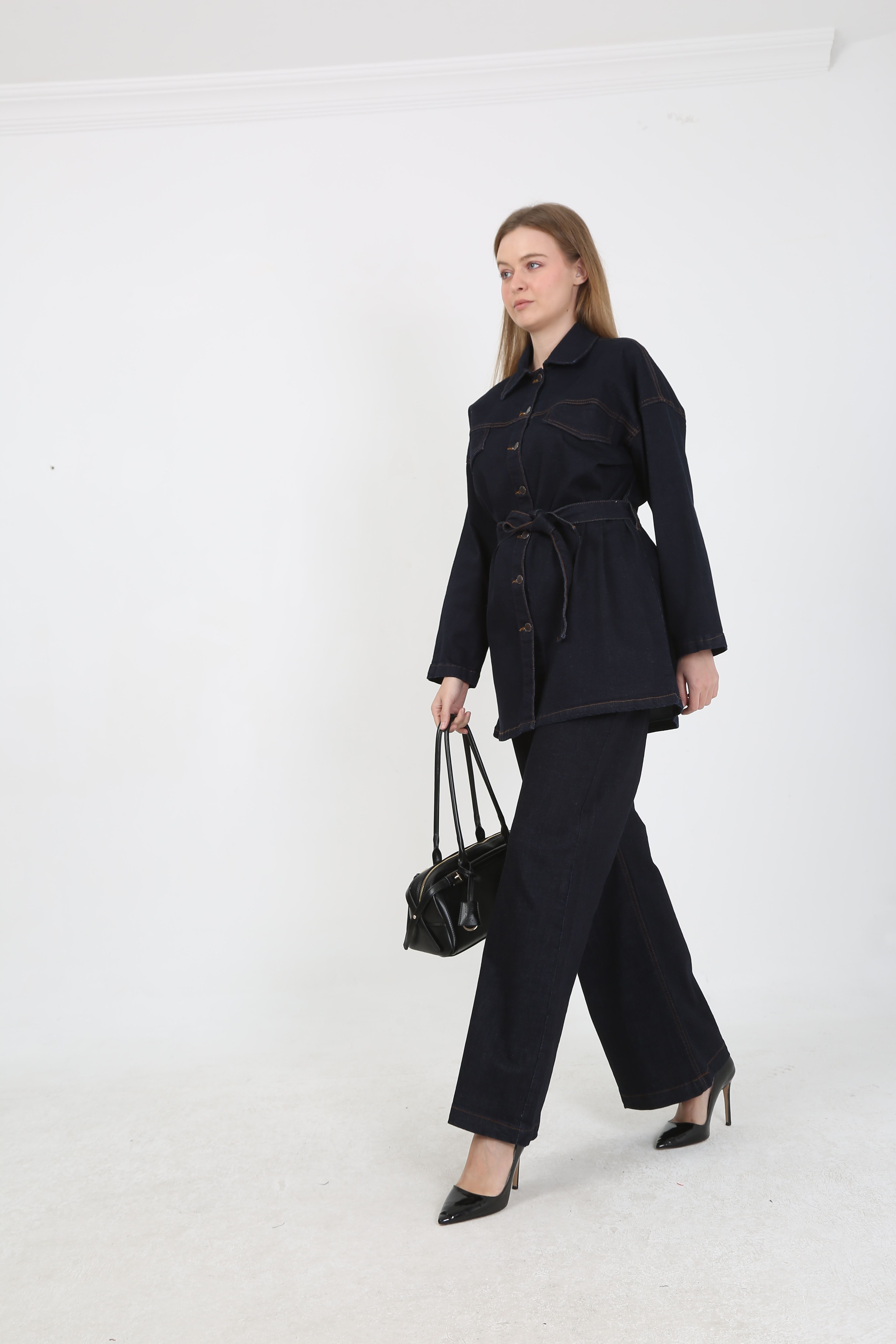 Günlük şıklığı yakalamak isteyenler için tasarlanan kadın denim kot takım, modern görünümüyle dikkat çekiyor. Üst bölümde yer alan kuşaklı uzun jean ceket, vücudu daha formda gösterirken; geniş paça yüksek bel pantolon rahat ve zarif bir duruş sunuyor.